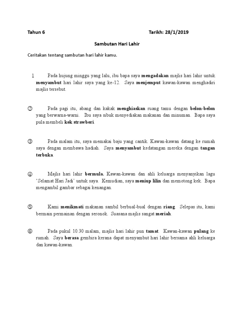 Live worksheets Malay Bahasa Melayu BM Karangan Karangan Sambutan Hari Jadi. Majlis Hari Lahir Saya Pada hari minggu yang lepas saya telah meraikan hari jadi saya yang ke-12 di rumah saya. Sekiranya terdapat perayaan kenegaraan seperti sambutan Hari Kebangsaan aku turut mengambil bahagian dalam perbarisan.
